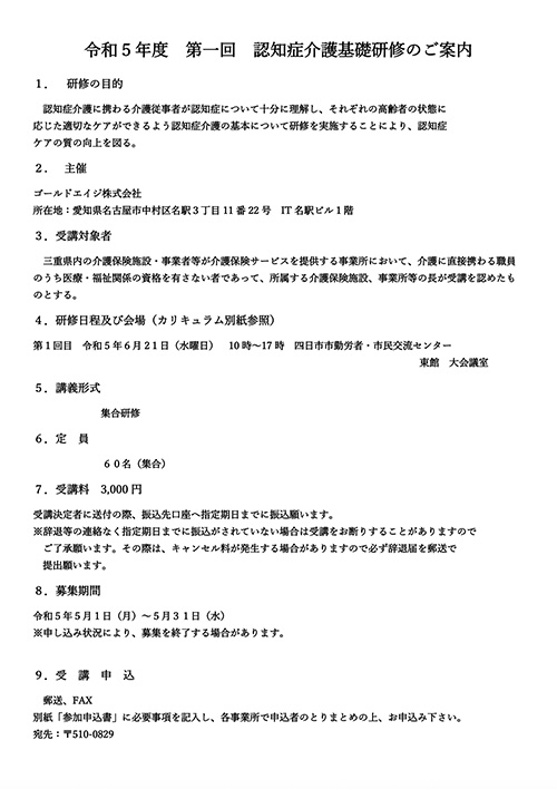ゴールドエイジ認知症介護基礎研修等養成事業の学則をご確認のうえ、お申し込みください。