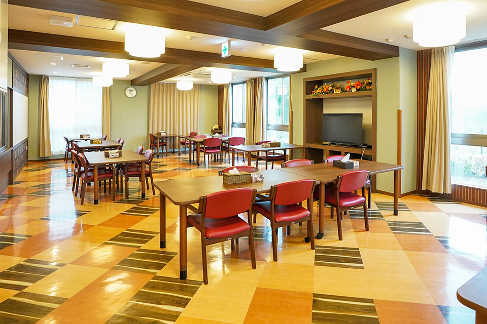 食堂、リビング、浴室、トイレ、洗面、ランドリー室、ナースコール、エアコン、カーテン、照明器具