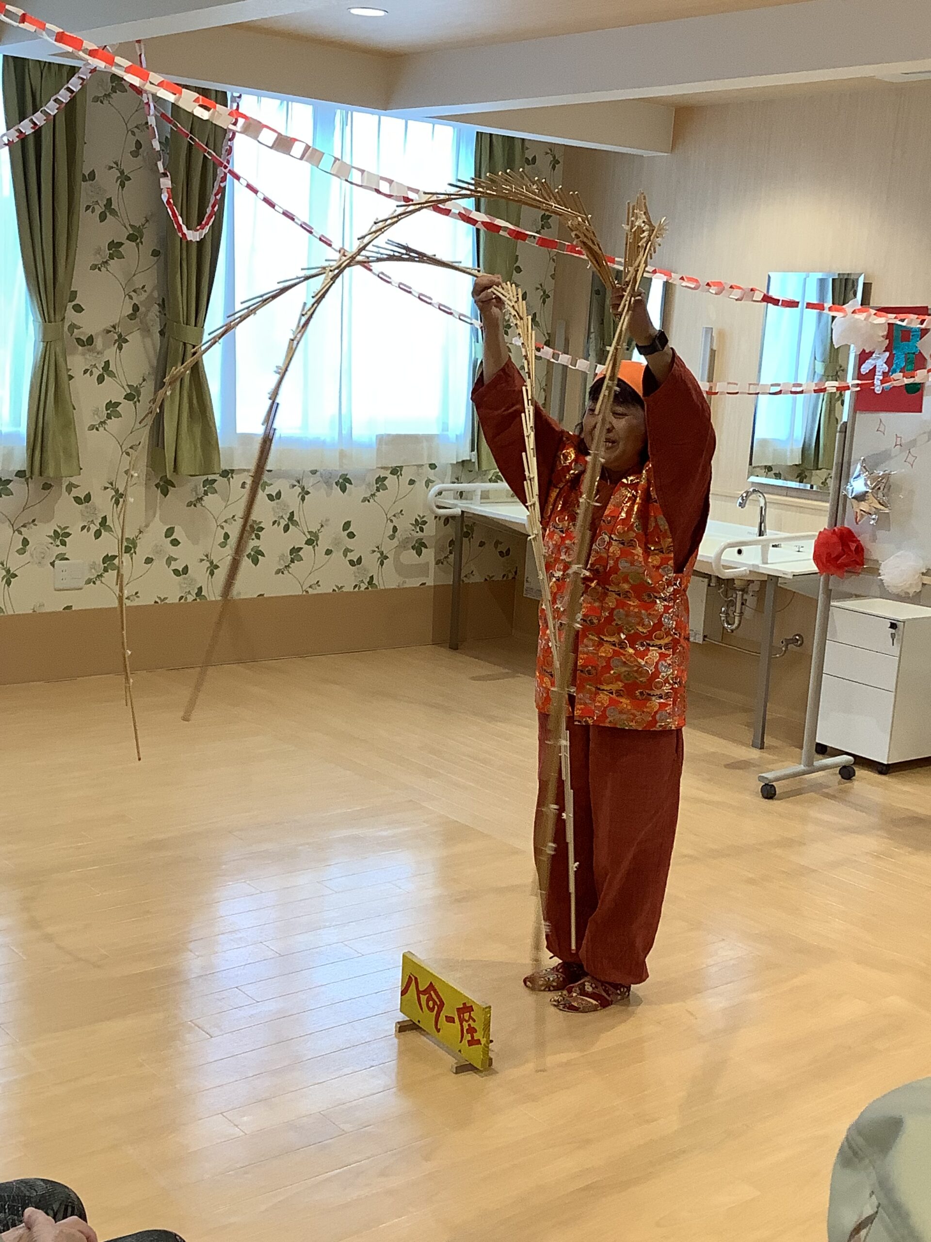 「あっ さて あっ さて さては南京玉すだれ」の歌詞に合わせて手拍子、