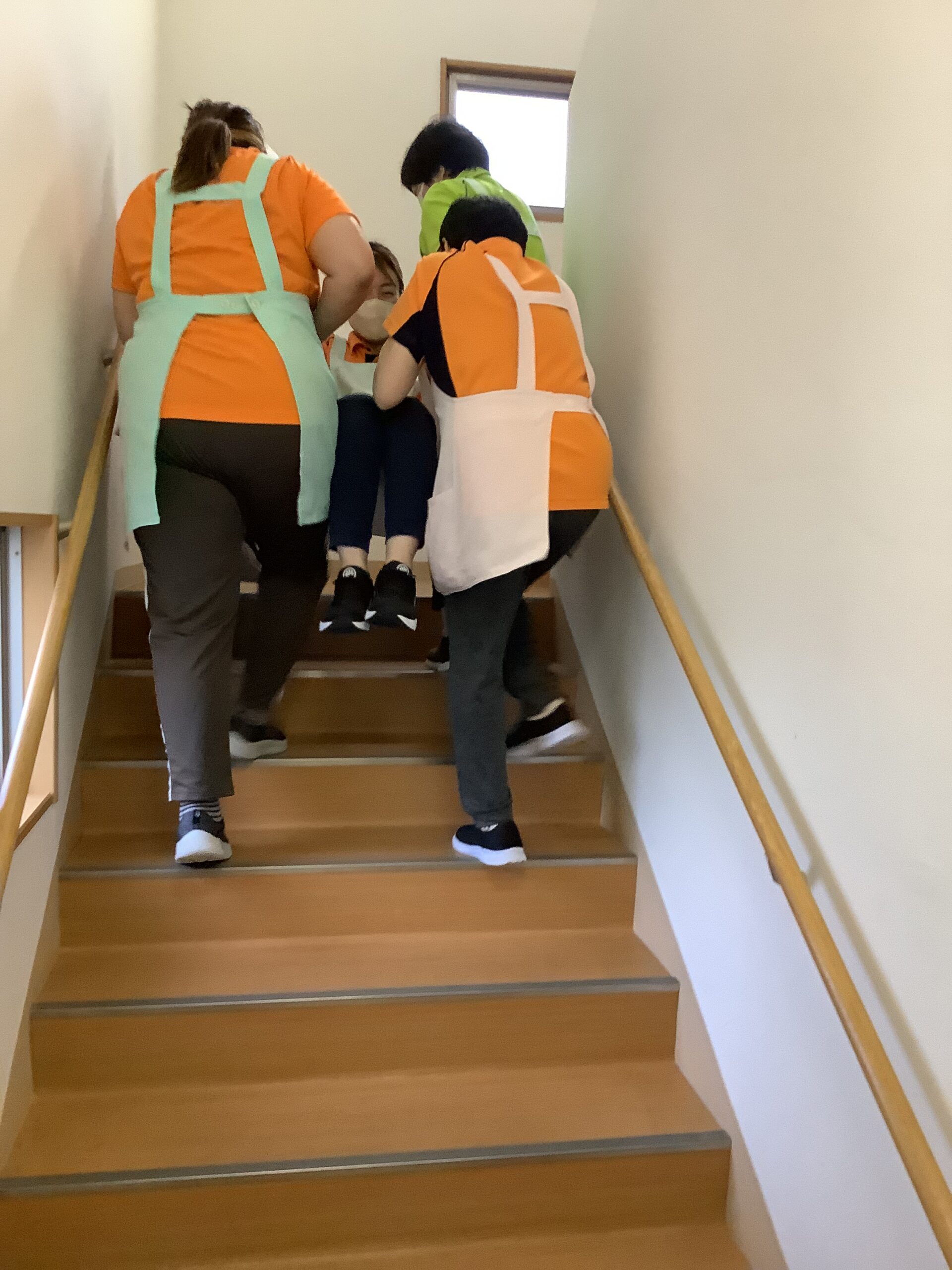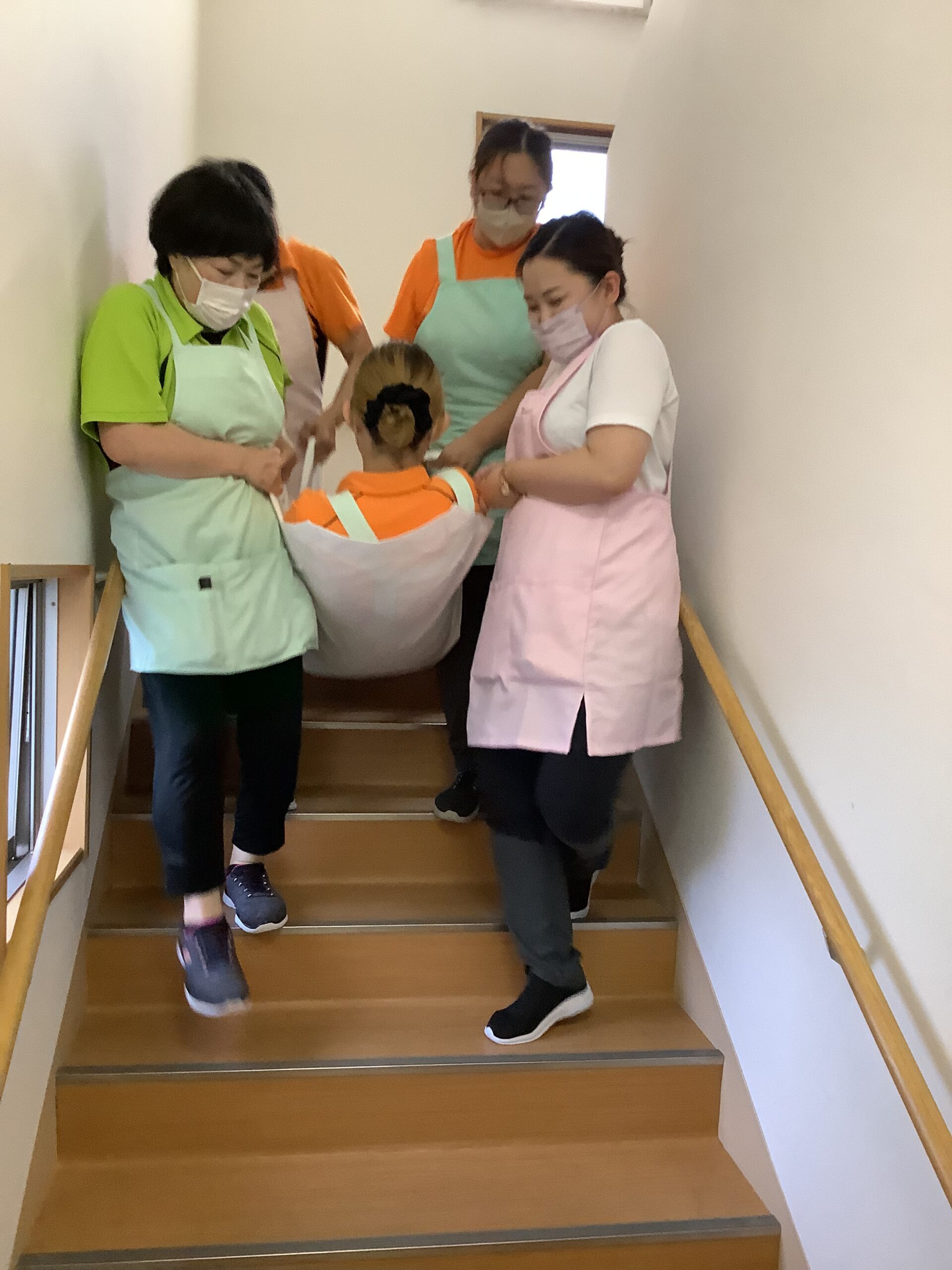 災害訓練では、救い帯を使用して階段の上がり下がりの訓練を行いました。