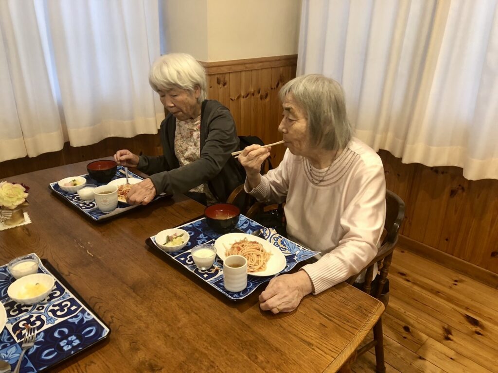 ゴールドエイジ藤沢の調理スタッフさんたちが手作りで腕を振るう「お楽しみメニュー」ですが、今回は、暑い夏を涼しげな料理で乗り切ってもらおうと、「冷製トマトパスタ」でした。