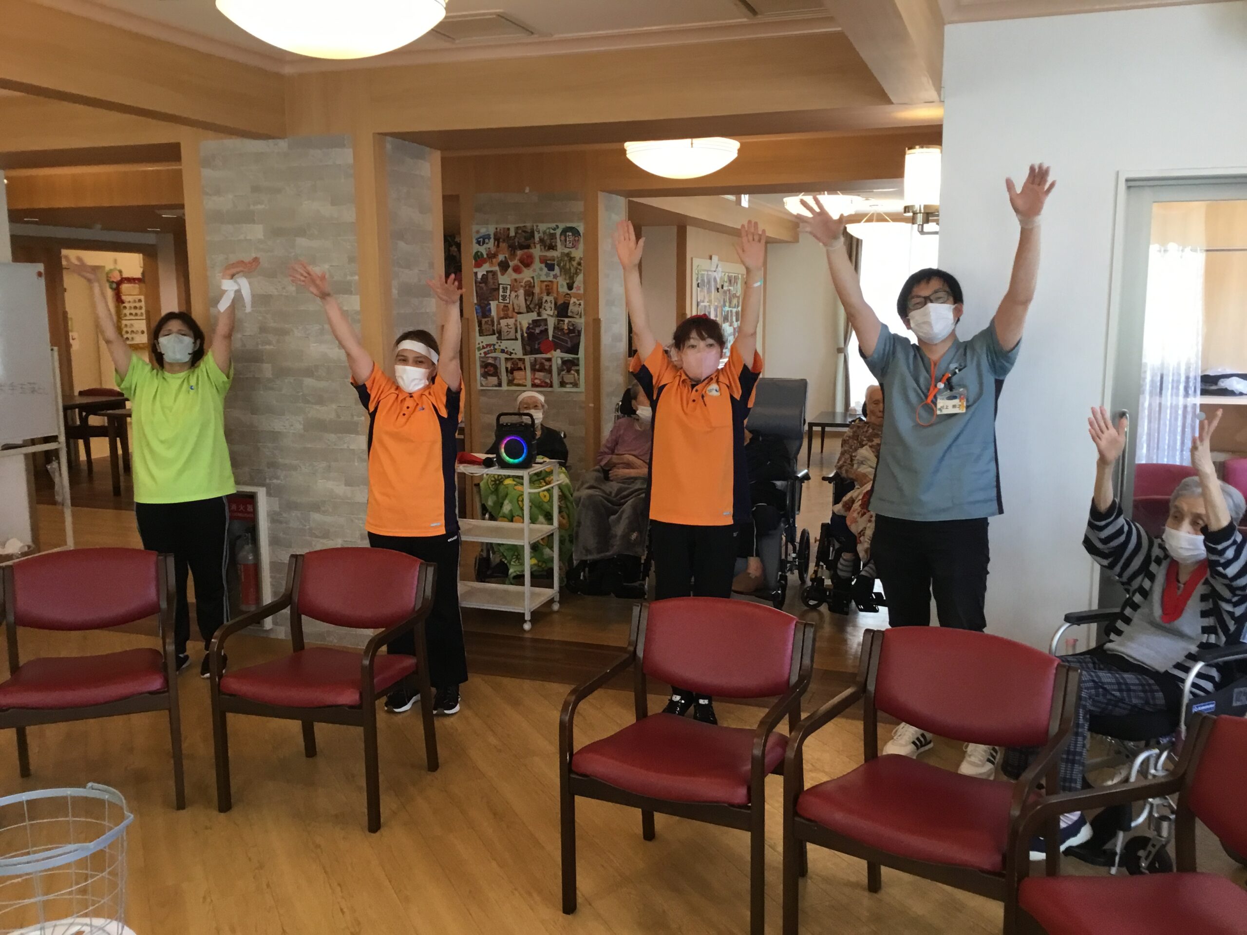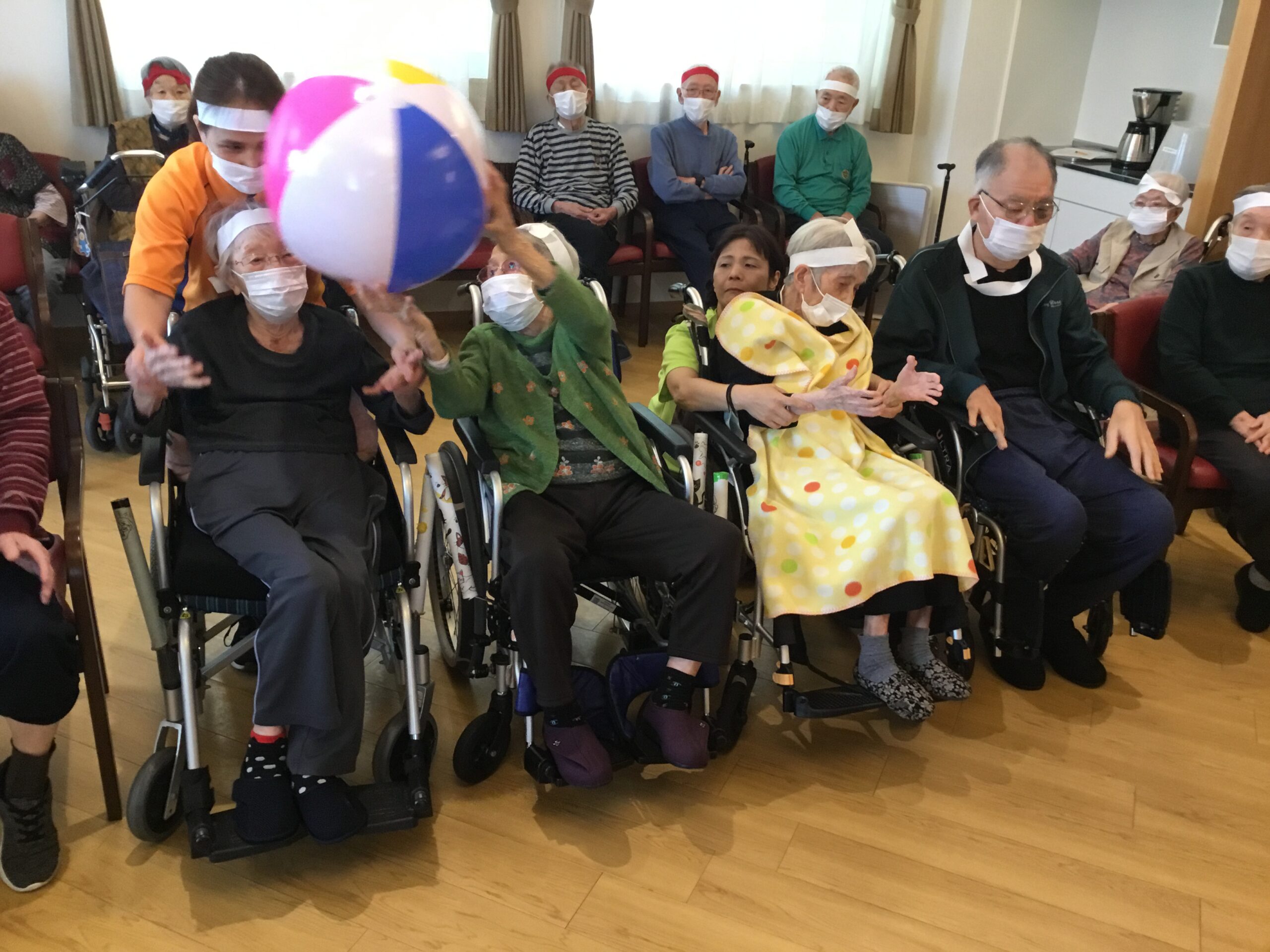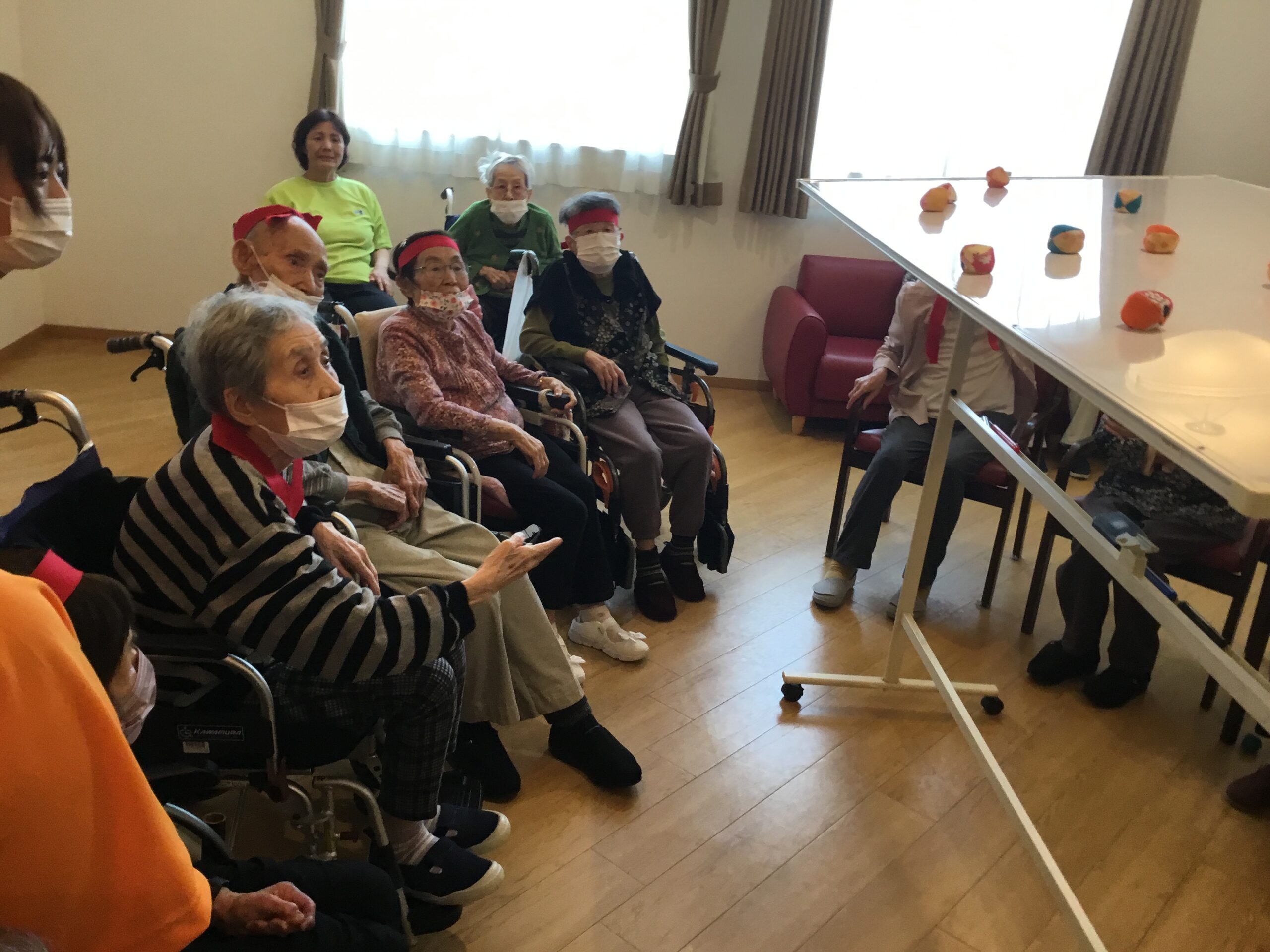 ゴールドエイジ花三千春の大運動会で行った競技が①玉入れ②大玉送りリレー③新種目!はらはらドキドキお手玉をいくつのせられるか!の3つの協議を行いました。