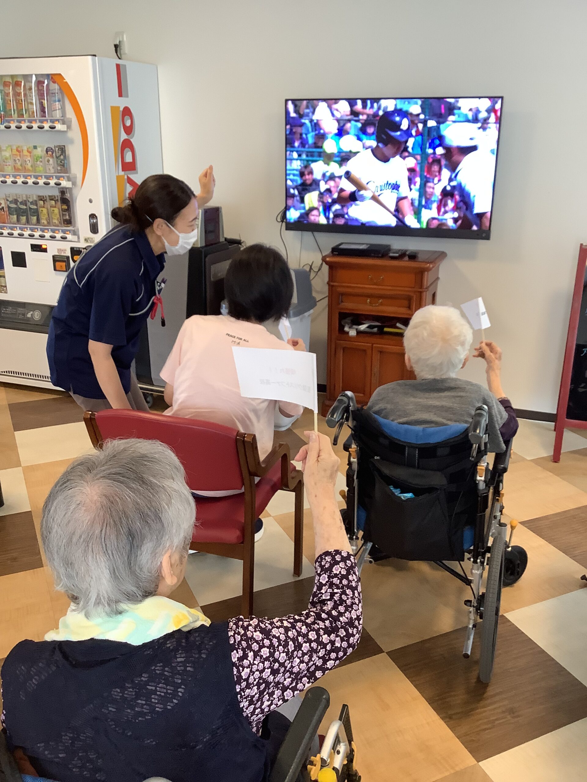 軽くて持ちやすい旗を作って入居者様と一緒に応援しました(^^)v