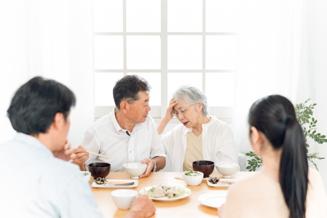 会話をしながら食事をしたり、焦って飲み込んだりするとむせやすいため、食事に集中するようにしましょう。