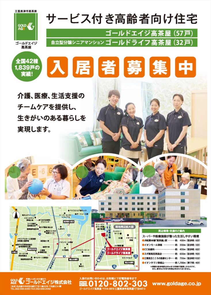 サービス付き高齢者向け住宅 ゴールドエイジ高茶屋は、現在入居者募集中です。