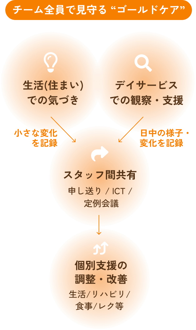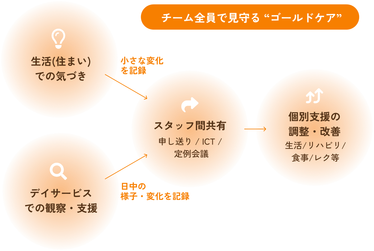 - 住居スタッフ ⇄ デイスタッフで情報を共有
