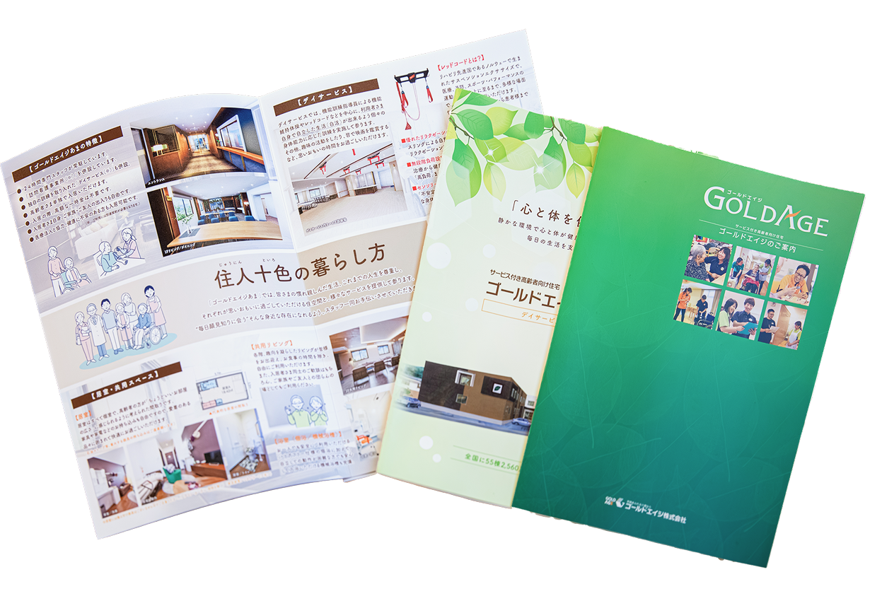 そんな方のために、 ゴールドエイジの会社情報やサービス、各ホームの特徴をまとめたパンフレットをご用意しています。